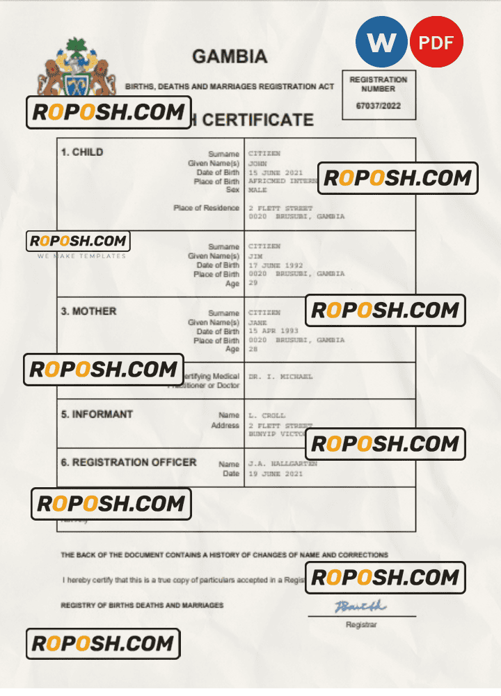roposh offers hundreds of high-quality, realistic, and customizable birth certificates. The Gambia birth certificate template is fully fillable, and you can complete it with any information you wish, such as name, surname, birth date, place of birth and etc. Whether you are using our PSD template (a layer-based adobe photoshop file) or our PDF template (a Microsoft Office editable file) you will get a package with fonts included instantly. No need to worry even if you can’t generate realistic birth proof yourself, we offer reliable editing service with your desired information for an extra charge. Also, we are always online and here to help you experience a confident purchase. So, reach out!