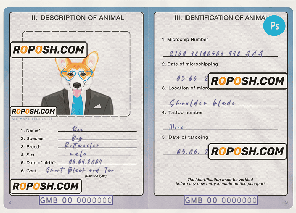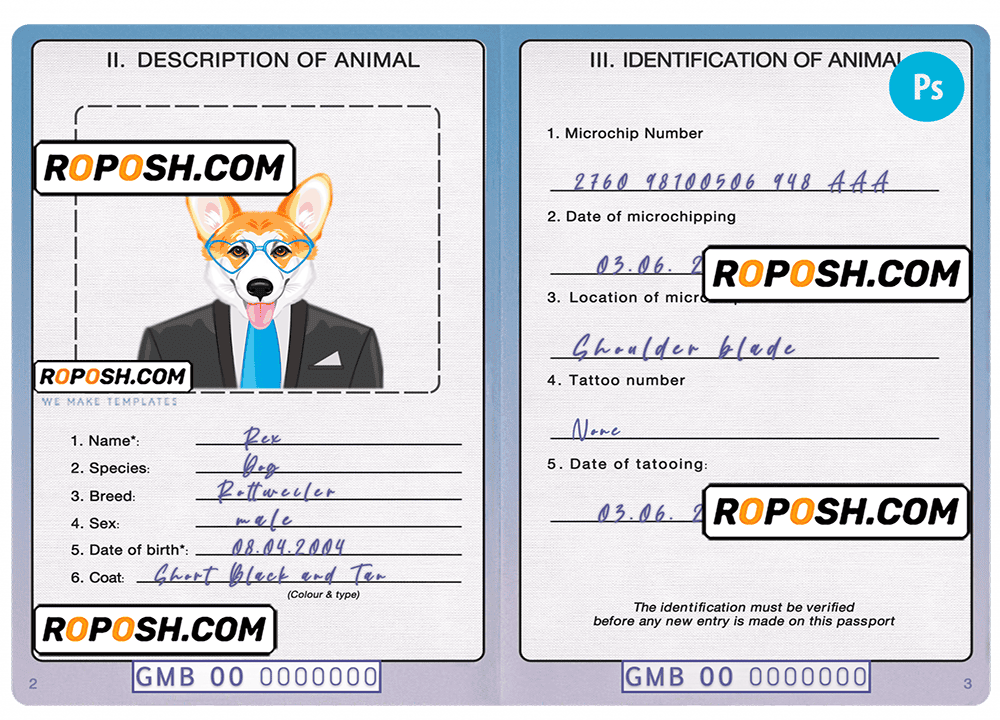 Gambia dog (animal, pet) passport PSD template, is designed to look and feel like real documents. Each template is carefully crafted to include all the necessary details, such as your pet’s name, breed, date of birth, and microchip information. With our fillable cat or dog passport templates, you can quickly and easily create a editable pet passport that meets all the requirements for international travel.