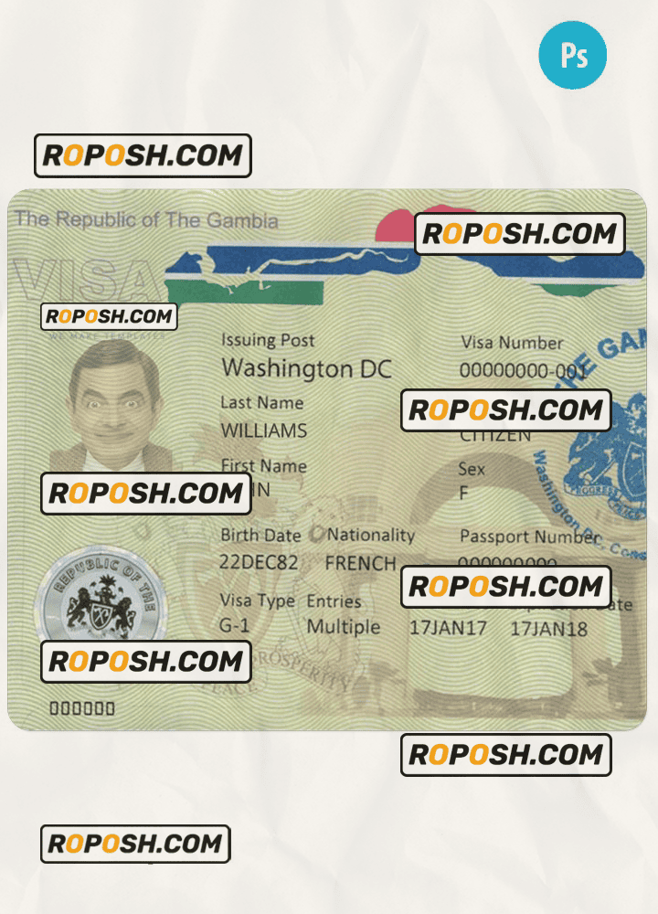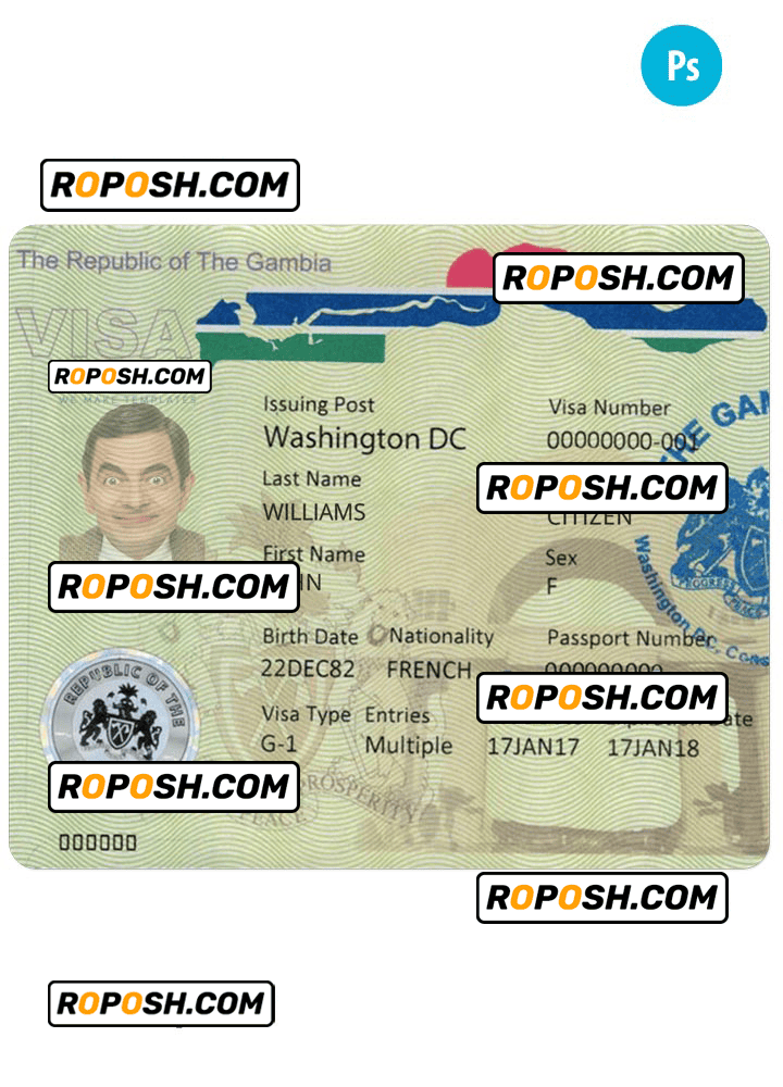 GAMBIA entry visa template psd. Buy Customizable Travel Visa Template with high quality and enjoy its unique features such as easy to customize, Layer based, fonts included sample. you can edit this template and put any name, address, license number, Id number, birth date, height, weight, expire date, change photos etc. This Photoshop template is a layer based psd file and it’s easy to Editing.To modify this photoshop template file you will need a Photo editing software such as Adobe Photoshop No need to be expert on editing software like adobe Photoshop. However, You just have to basic knowledge on adobe photoshop, to edit this template. Never used low quality template. Your account may be suspended. Also, if you’re looking for an editable SSN template, Roposh is by your side so you can get it easily and even for free.