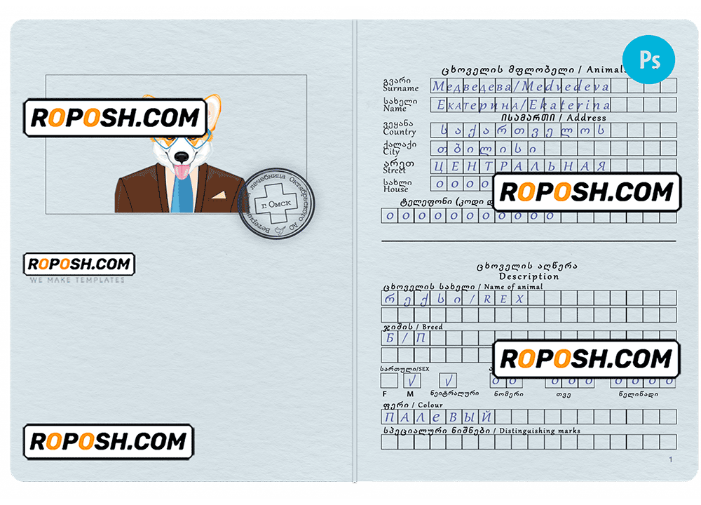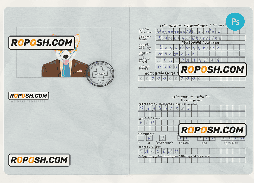 Georgia dog (animal, pet) passport PSD template, is designed to look and feel like real documents. Each template is carefully crafted to include all the necessary details, such as your pet’s name, breed, date of birth, and microchip information. With our fillable cat or dog passport templates, you can quickly and easily create a editable pet passport that meets all the requirements for international travel.