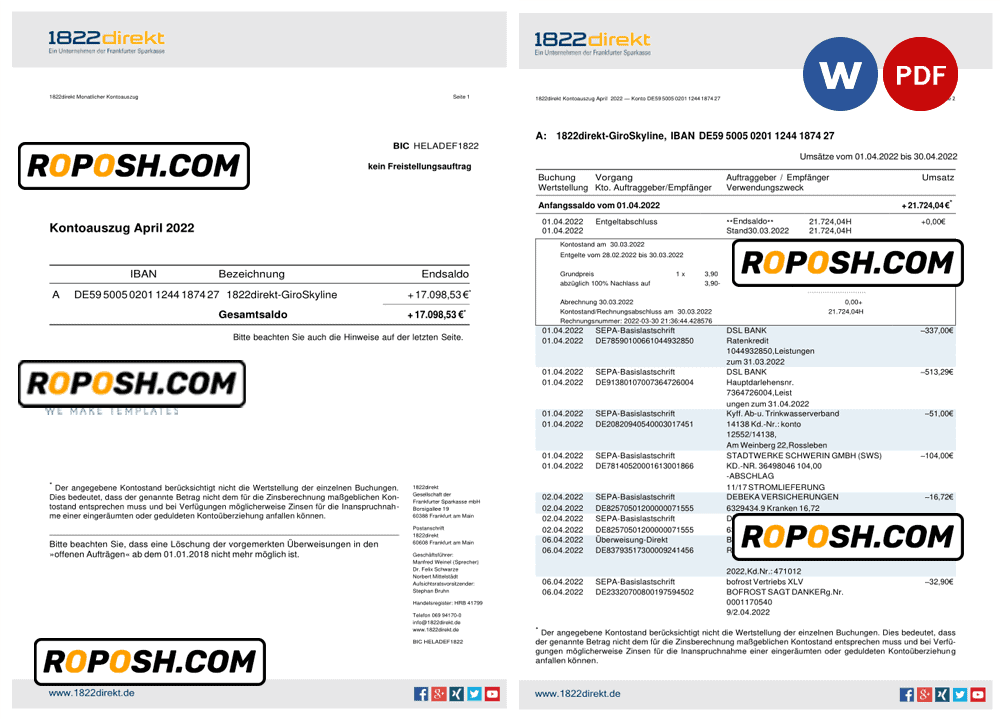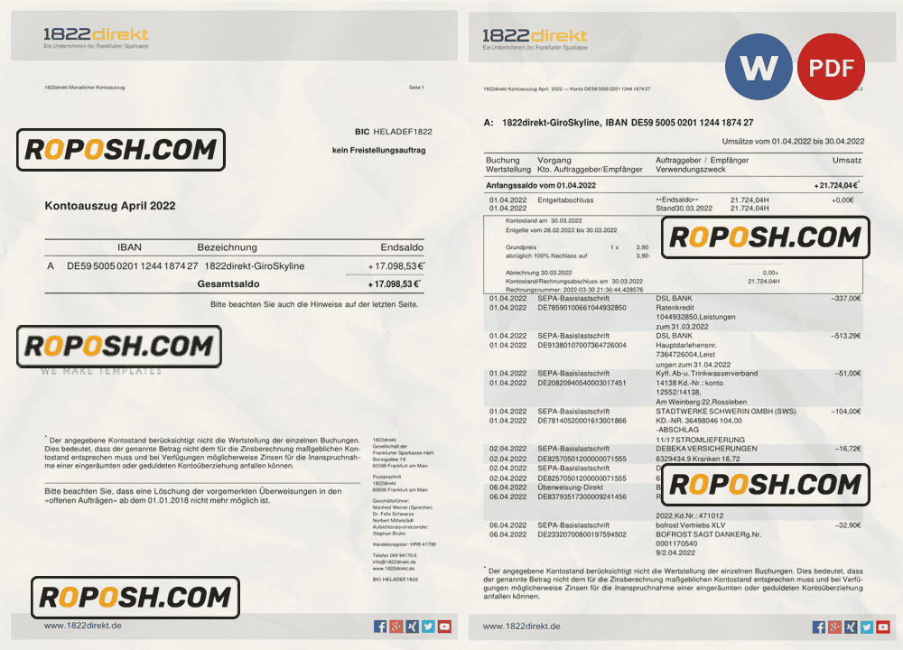 Download the fully editable Germany 1822direkt bank statement template from Roposh and personalize it to create your own novelty documents. Ideal for replacing expired, stolen, or unavailable bank statements. We also offer editable credit card templates, ID card templates, bank statement PSD templates, driver’s license PSD templates, and printable editable blank utility bill templates.