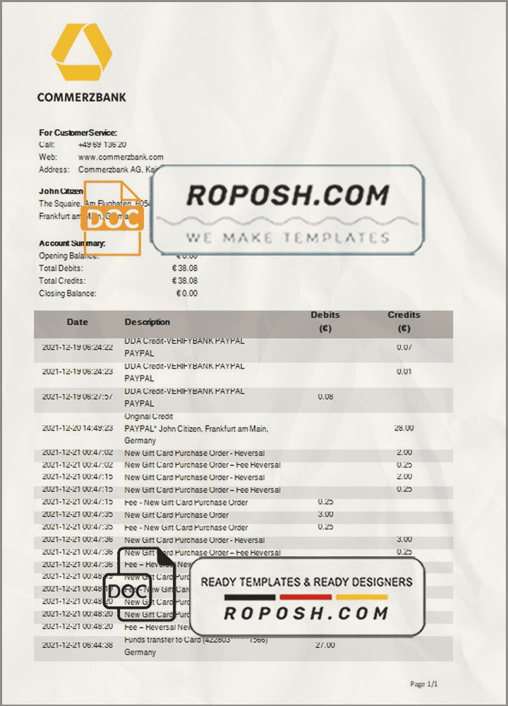 Grab now fully editable Germany Commerzbank bank statement Word Template from our website Roposh and put your own info to create Realistic Bank Statement Word template and ready your own novelty documents. It’ll be so beneficial if your Bank Statement is expired, stolen or not available.We also have editable credit card, ID Card psd template, Bank Statement psd template, drivers license psd template & printable editable blank utility bill template.