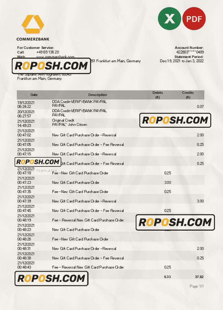 Grab now fully editable Germany Commerzbank statement Excel Template from our website Roposh and put your own info to create Realistic Bank Statement template Excel and ready your own novelty documents. It’ll be so beneficial if your Bank Statement is expired, stolen or not available.We also have editable credit card, ID Card psd template, Bank Statement psd template, drivers license psd template & printable editable blank utility bill template.