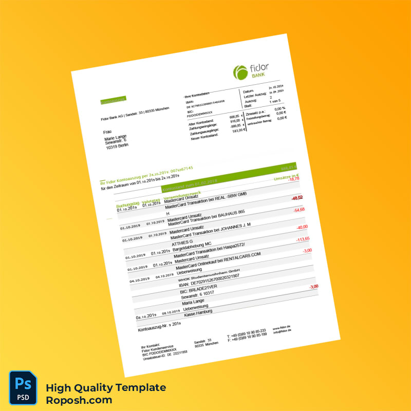 Struggling to provide the necessary financial documentation for a loan application, rental agreement, or visa application? The Germany Fidor Bank Statement Template is here to simplify your life. Crafted for both personal and professional needs, this meticulously designed template allows you to create authentic-looking bank statements swiftly and efficiently.