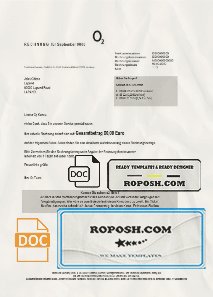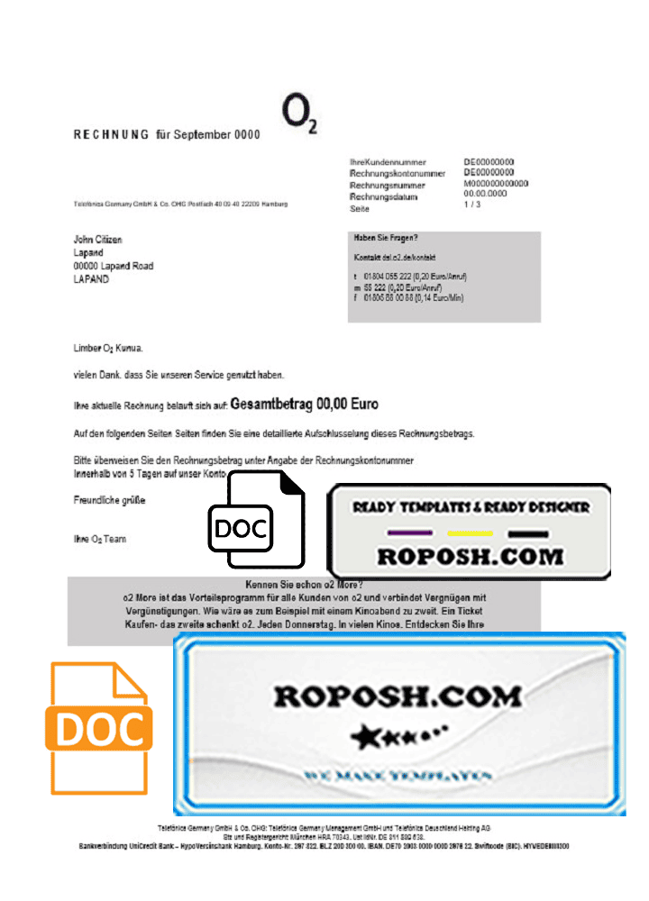 Get your hands on the blank Germany RECHNUNG O2 utility bill template from our website, Roposh. Customize it with your own information to create a convincing proof of address document. This template is especially useful if your original utility bill is expired, lost, or unavailable. Additionally, explore our range of templates including passport PSD templates, ID card PSD templates, bank statement PSD templates, driver’s license PSD templates, and utility bill PSD templates.