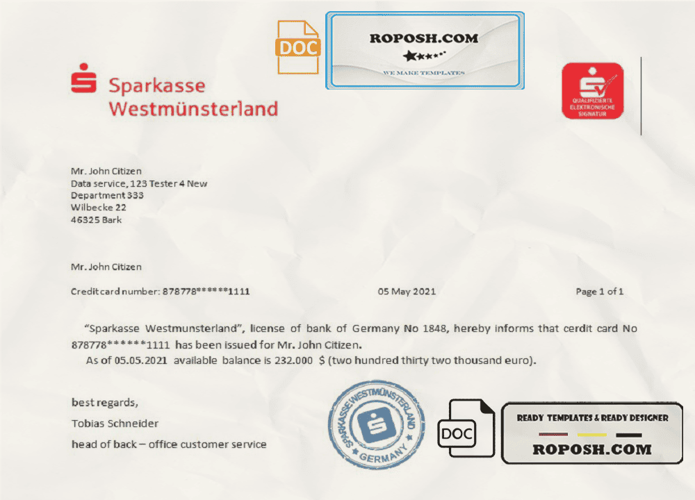 Germany Sparkasse bank account reference letter template in Word and PDF format