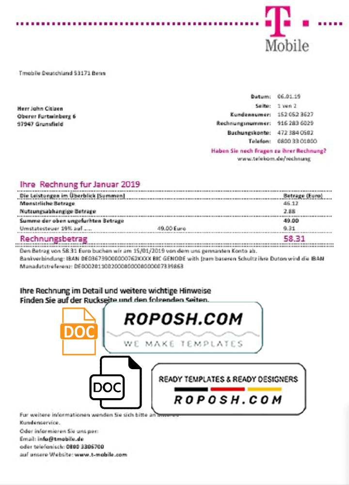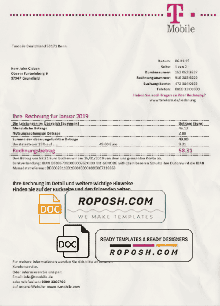 Get your blank Germany T Mobile utility bill template from Roposh today. Customize it with your own information to create a realistic editable utility bill for proof of address. Ideal for situations where your utility bill is expired, stolen, or unavailable. We also offer a variety of other templates, including passport PSD templates, ID card PSD templates, bank statement PSD templates, driver’s license PSD templates, and utility bill PSD templates.