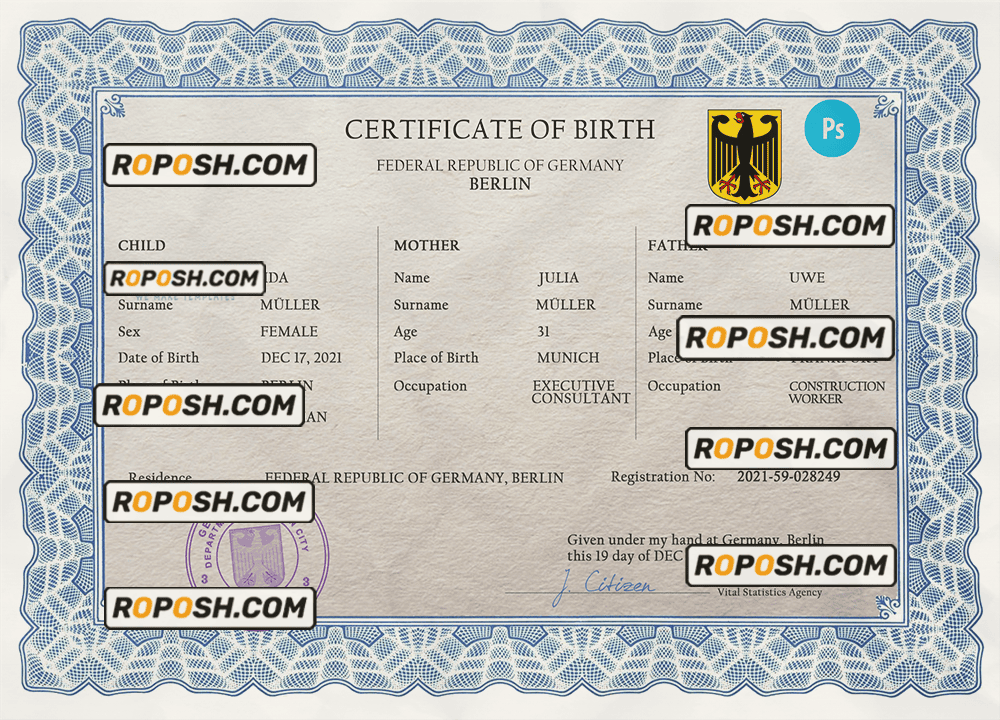 roposh offers hundreds of high-quality, realistic, and customizable birth certificates. The Germany birth certificate template is fully fillable, and you can complete it with any information you wish, such as name, surname, birth date, place of birth and etc. Whether you are using our PSD template (a layer-based adobe photoshop file) or our PDF template (a Microsoft Office editable file) you will get a package with fonts included instantly. No need to worry even if you can’t generate realistic birth proof yourself, we offer reliable editing service with your desired information for an extra charge. Also, we are always online and here to help you experience a confident purchase. So, reach out!
