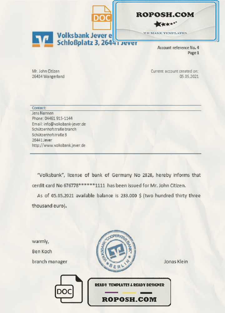 Germany Volksbank bank account reference letter template in Word and PDF format
