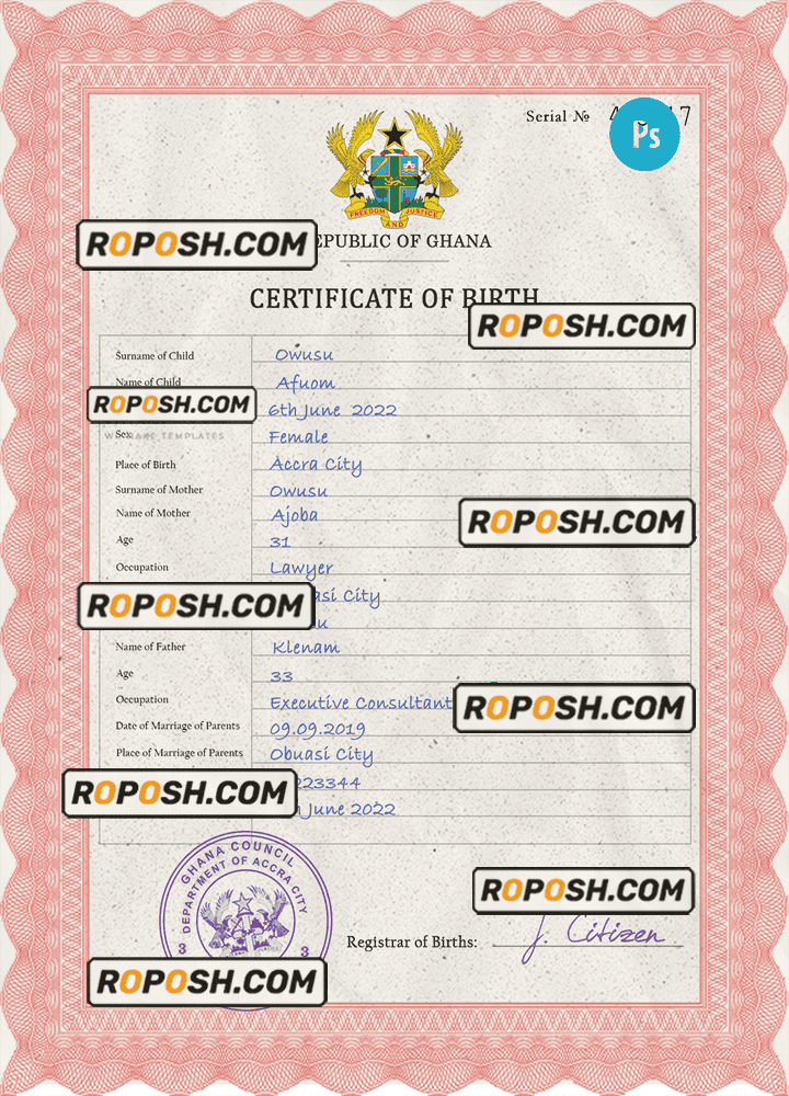roposh offers hundreds of high-quality, realistic, and customizable birth certificates. The Ghana birth certificate template is fully fillable, and you can complete it with any information you wish, such as name, surname, birth date, place of birth and etc. Whether you are using our PSD template (a layer-based adobe photoshop file) or our PDF template (a Microsoft Office editable file) you will get a package with fonts included instantly. No need to worry even if you can’t generate realistic birth proof yourself, we offer reliable editing service with your desired information for an extra charge. Also, we are always online and here to help you experience a confident purchase. So, reach out!