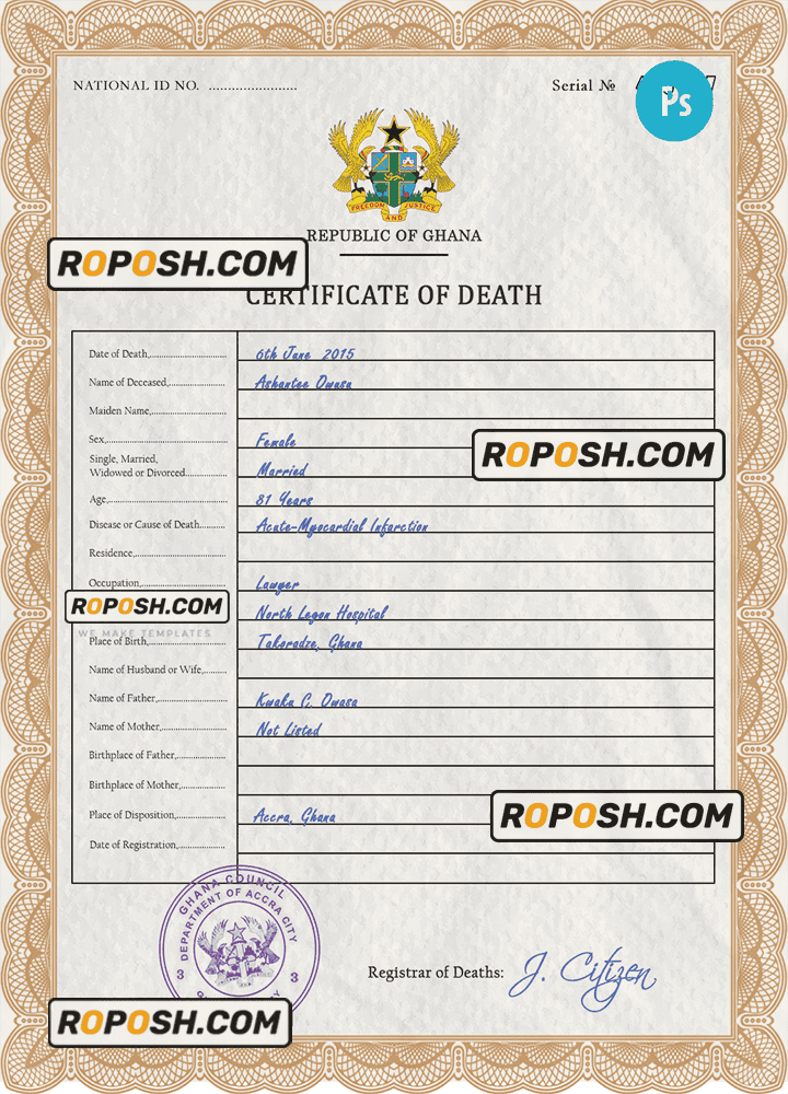 Ghana vital record death certificate PSD template, completely editable