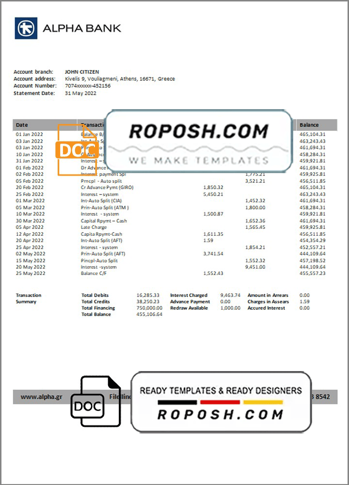 Grab now fully editable Greece Alpha bank statement Word Template from our website Roposh and put your own info to create Realistic Bank Statement Word template and ready your own novelty documents. It’ll be so beneficial if your Bank Statement is expired, stolen or not available.We also have editable credit card, ID Card psd template, Bank Statement psd template, drivers license psd template & printable editable blank utility bill template.