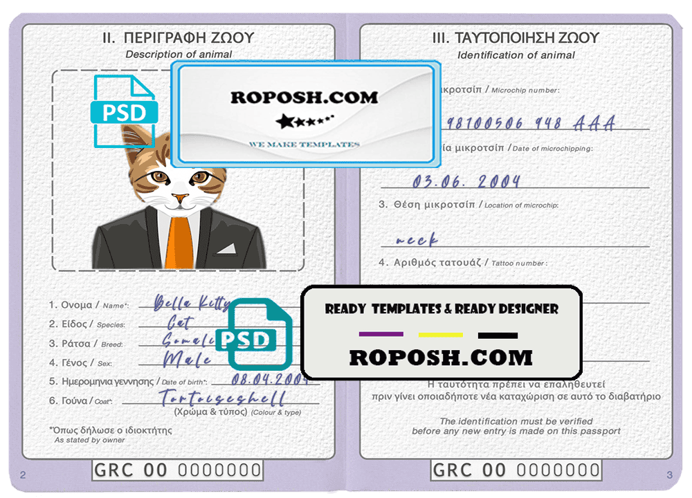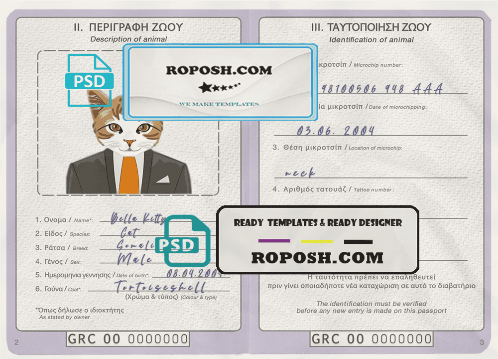 Greece cat (animal, pet) passport PSD template, is your one-stop-shop for realistic and editable editable pet identity cards and passports. We specialize in creating high-quality, customizable editable pet passports and identity cards for dogs, cats, and other furry friends.