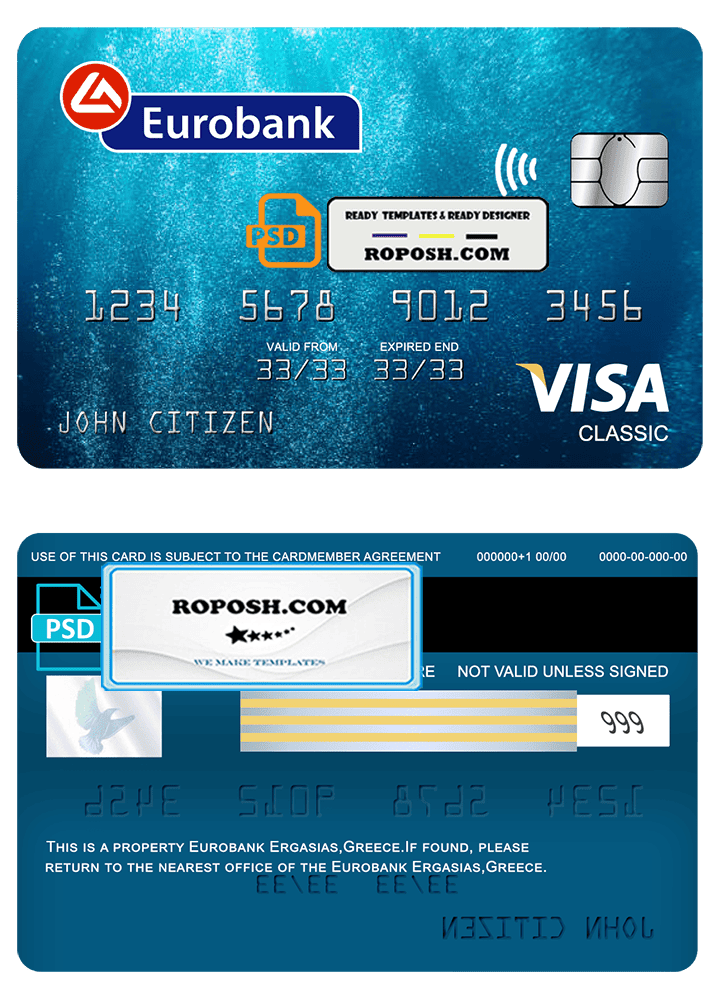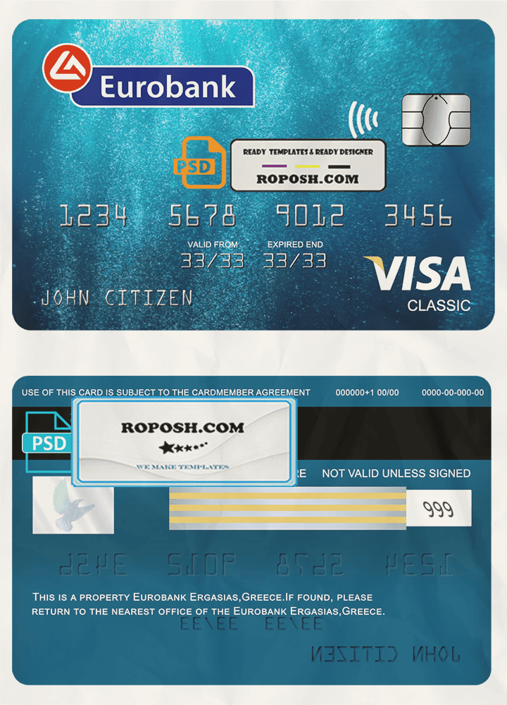 This Greece Eurobank Ergasias bank visa classic card PSD Template is perfect for a variety of uses, such as removing PayPal account limitations, verifying Facebook accounts, and more. You can even use it to create copies of your credit card for novelty documents. We have a variety of other templates available, including passport templates, ID card templates, bank statement templates, and more.