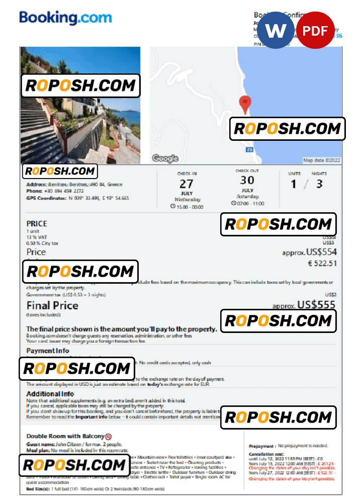 This Blank Greece hotel booking confirmation PDF Template is perfect for a variety of uses, such as Visa applications, proof of accommodation, showing your expenses, and more. You can even use it to create realistic copies of your credit card for novelty documents. We have a variety of other templates available, including passport templates, ID card templates, reciept template, and more.