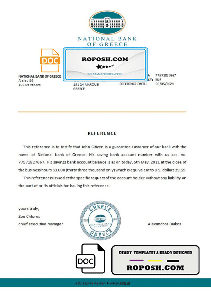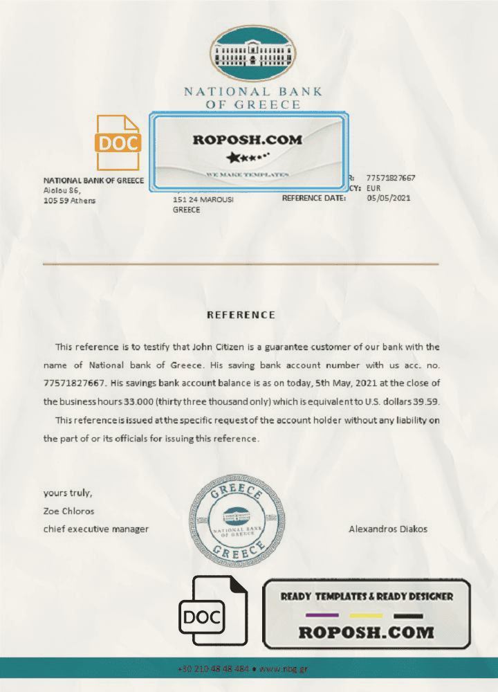 Greece National Bank of Greece bank reference letter template in Word and PDF format