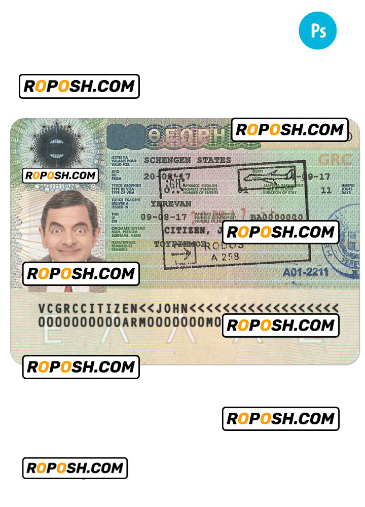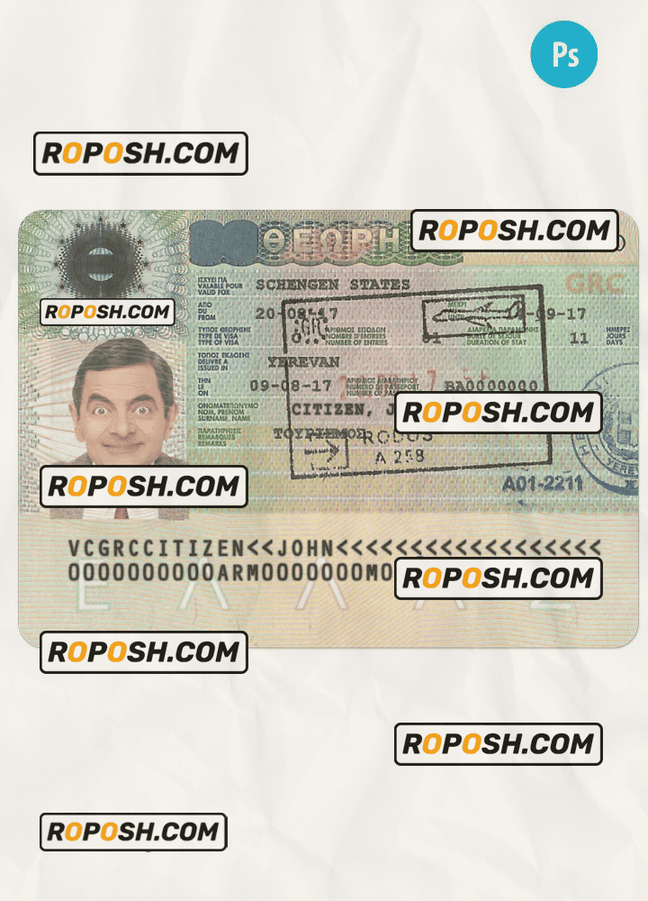 GREECE Schengen visa template psd. Buy Customizable Travel Visa Template with high quality and enjoy its unique features such as easy to customize, Layer based, fonts included sample. you can edit this template and put any name, address, license number, Id number, birth date, height, weight, expire date, change photos etc. This Photoshop template is a layer based psd file and it’s easy to Editing.To modify this photoshop template file you will need a Photo editing software such as Adobe Photoshop No need to be expert on editing software like adobe Photoshop. However, You just have to basic knowledge on adobe photoshop, to edit this template. Never used low quality template. Your account may be suspended. Also, if you’re looking for an editable SSN template, Roposh is by your side so you can get it easily and even for free.