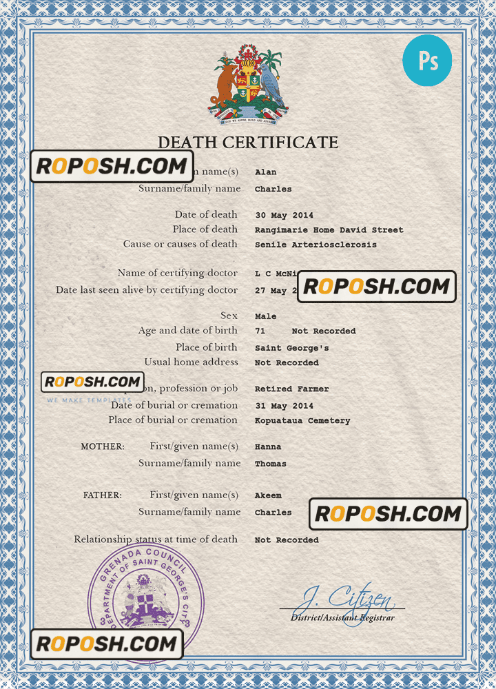 Grenada death certificate PSD template, completely editable
