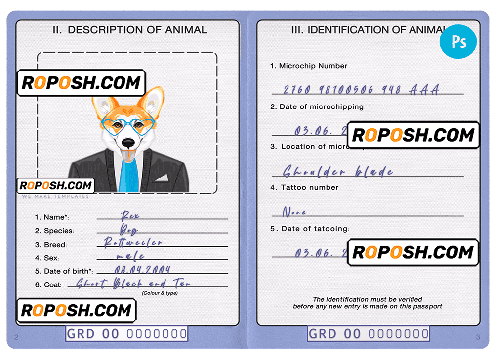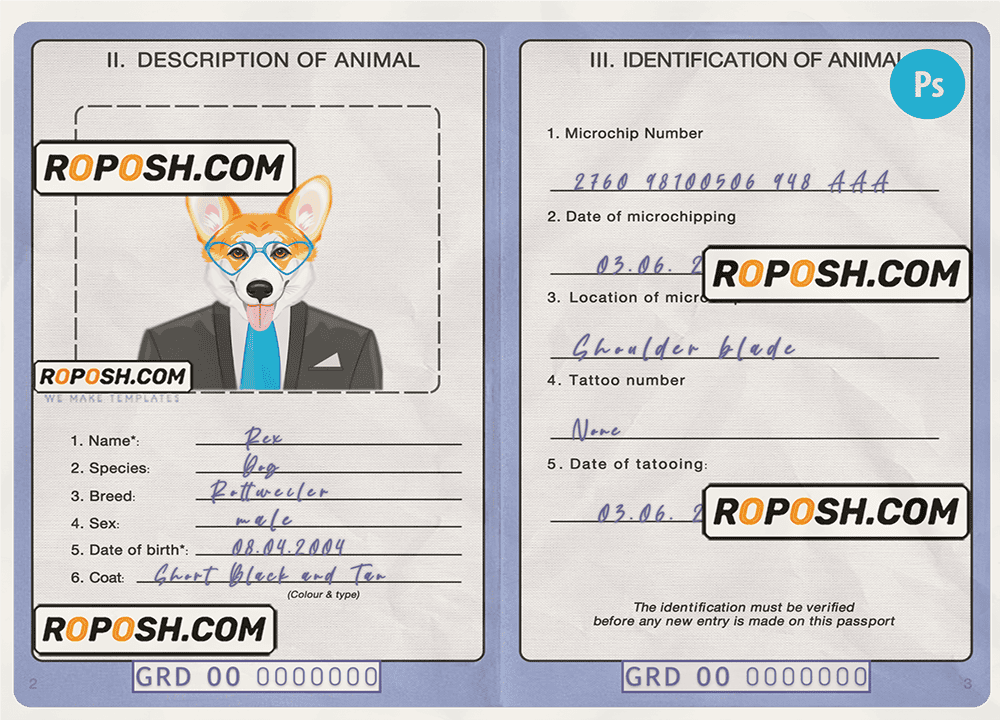 Grenada dog (animal, pet) passport PSD template, is designed to look and feel like real documents. Each template is carefully crafted to include all the necessary details, such as your pet’s name, breed, date of birth, and microchip information. With our fillable cat or dog passport templates, you can quickly and easily create a editable pet passport that meets all the requirements for international travel.