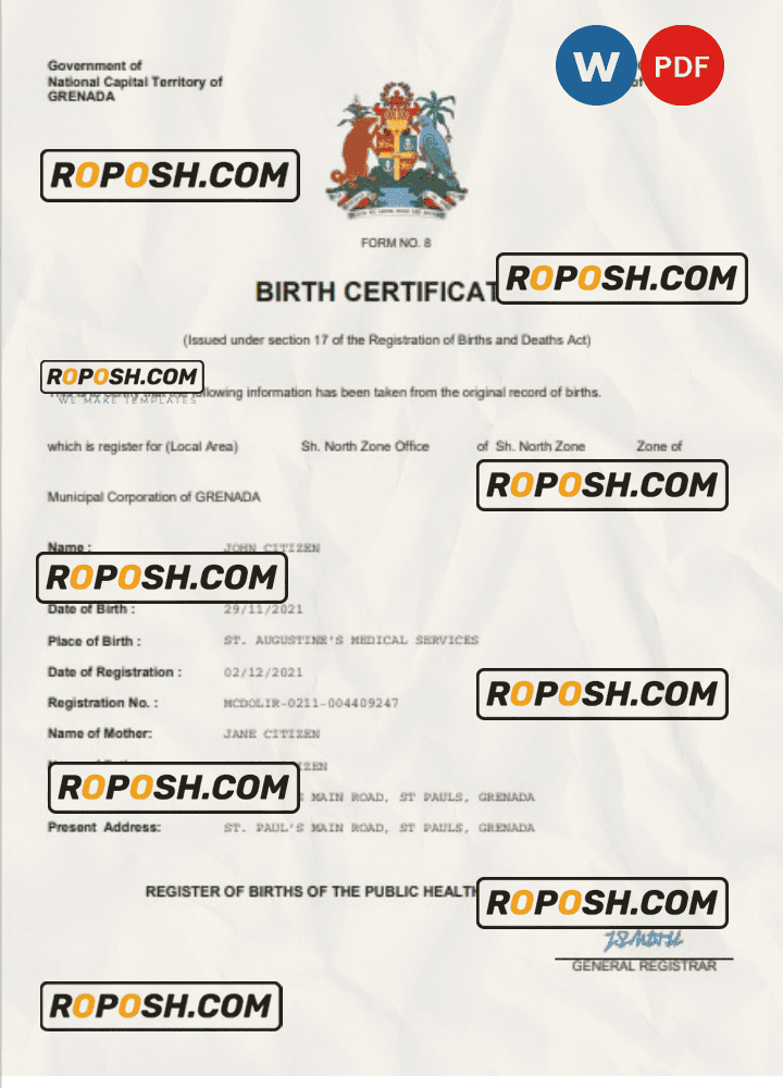 roposh offers hundreds of high-quality, realistic, and customizable birth certificates. The Grenada birth certificate template is fully fillable, and you can complete it with any information you wish, such as name, surname, birth date, place of birth and etc. Whether you are using our PSD template (a layer-based adobe photoshop file) or our PDF template (a Microsoft Office editable file) you will get a package with fonts included instantly. No need to worry even if you can’t generate realistic birth proof yourself, we offer reliable editing service with your desired information for an extra charge. Also, we are always online and here to help you experience a confident purchase. So, reach out!