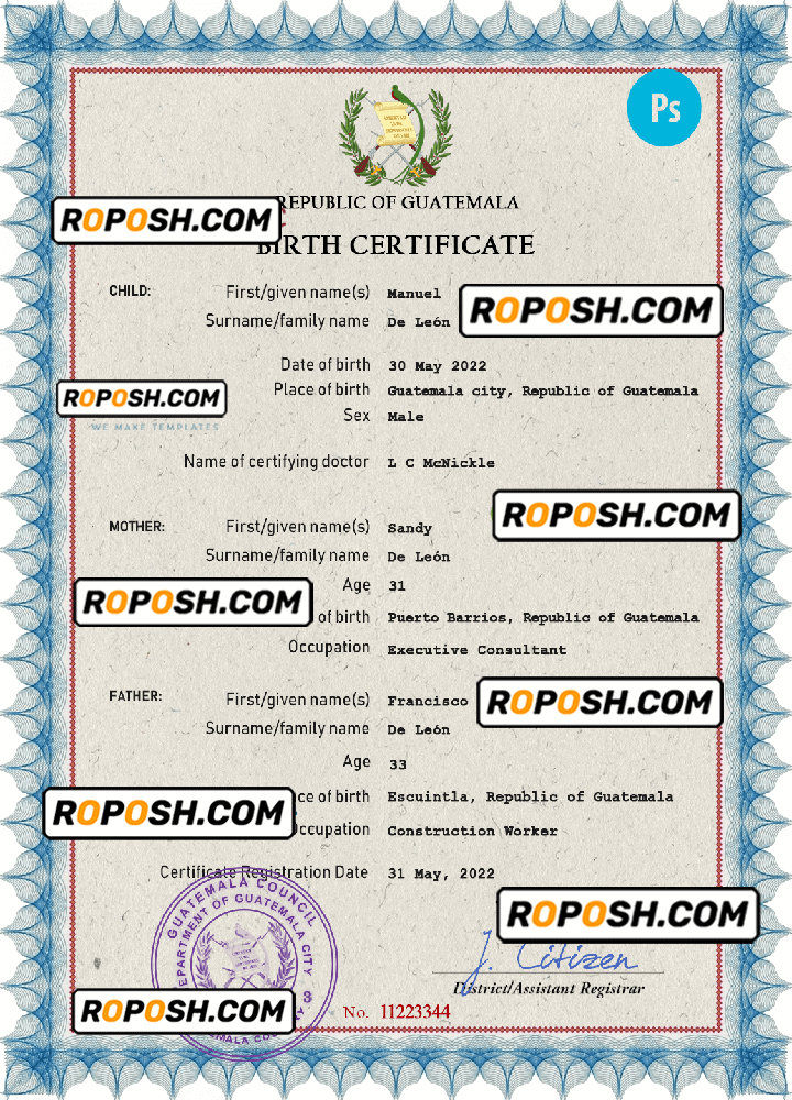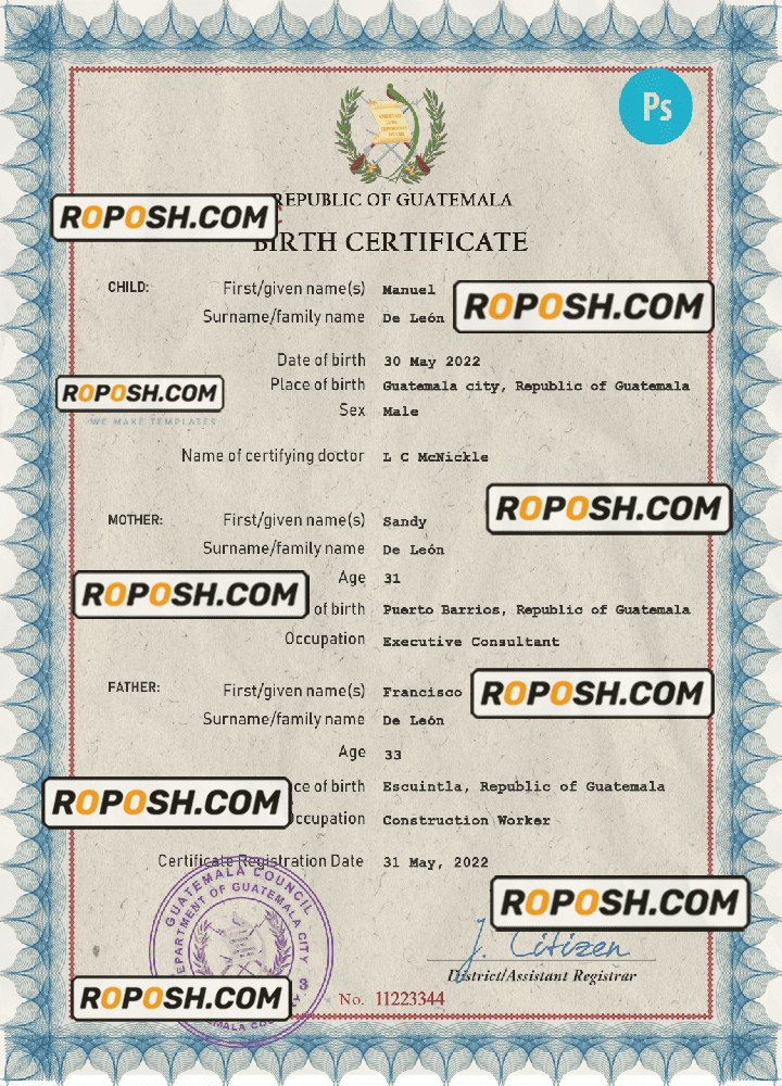 roposh offers hundreds of high-quality, realistic, and customizable birth certificates. The Guatemala birth certificate template is fully fillable, and you can complete it with any information you wish, such as name, surname, birth date, place of birth and etc. Whether you are using our PSD template (a layer-based adobe photoshop file) or our PDF template (a Microsoft Office editable file) you will get a package with fonts included instantly. No need to worry even if you can’t generate realistic birth proof yourself, we offer reliable editing service with your desired information for an extra charge. Also, we are always online and here to help you experience a confident purchase. So, reach out!