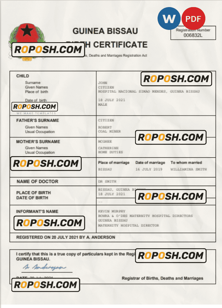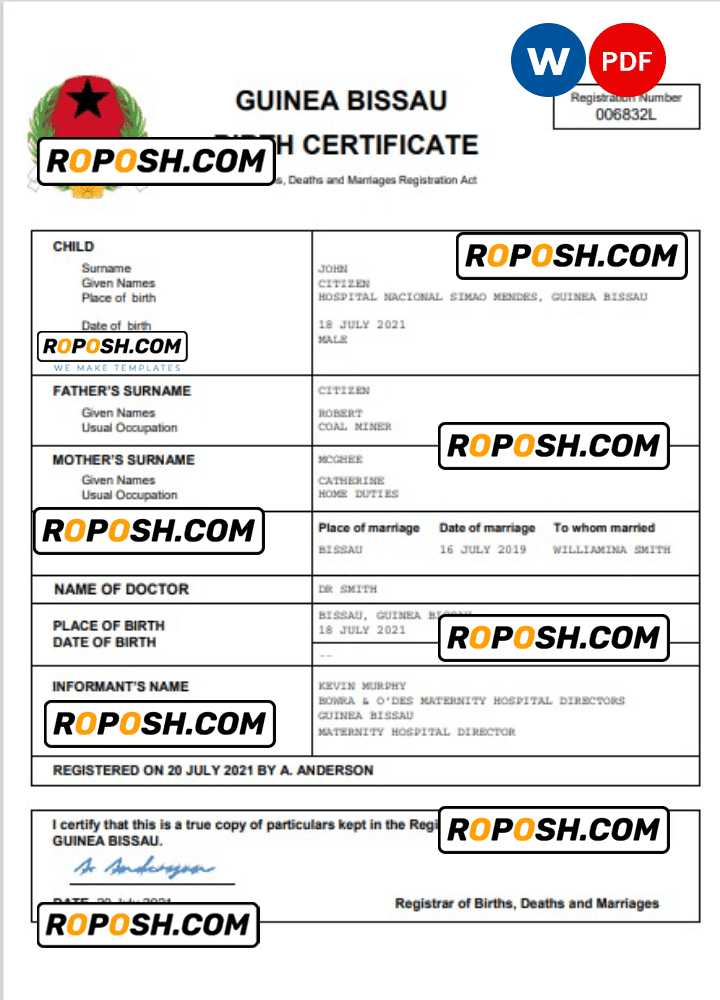 roposh offers hundreds of high-quality, realistic, and customizable birth certificates. The Guinea Bissau birth certificate template is fully fillable, and you can complete it with any information you wish, such as name, surname, birth date, place of birth and etc. Whether you are using our PSD template (a layer-based adobe photoshop file) or our PDF template (a Microsoft Office editable file) you will get a package with fonts included instantly. No need to worry even if you can’t generate realistic birth proof yourself, we offer reliable editing service with your desired information for an extra charge. Also, we are always online and here to help you experience a confident purchase. So, reach out!