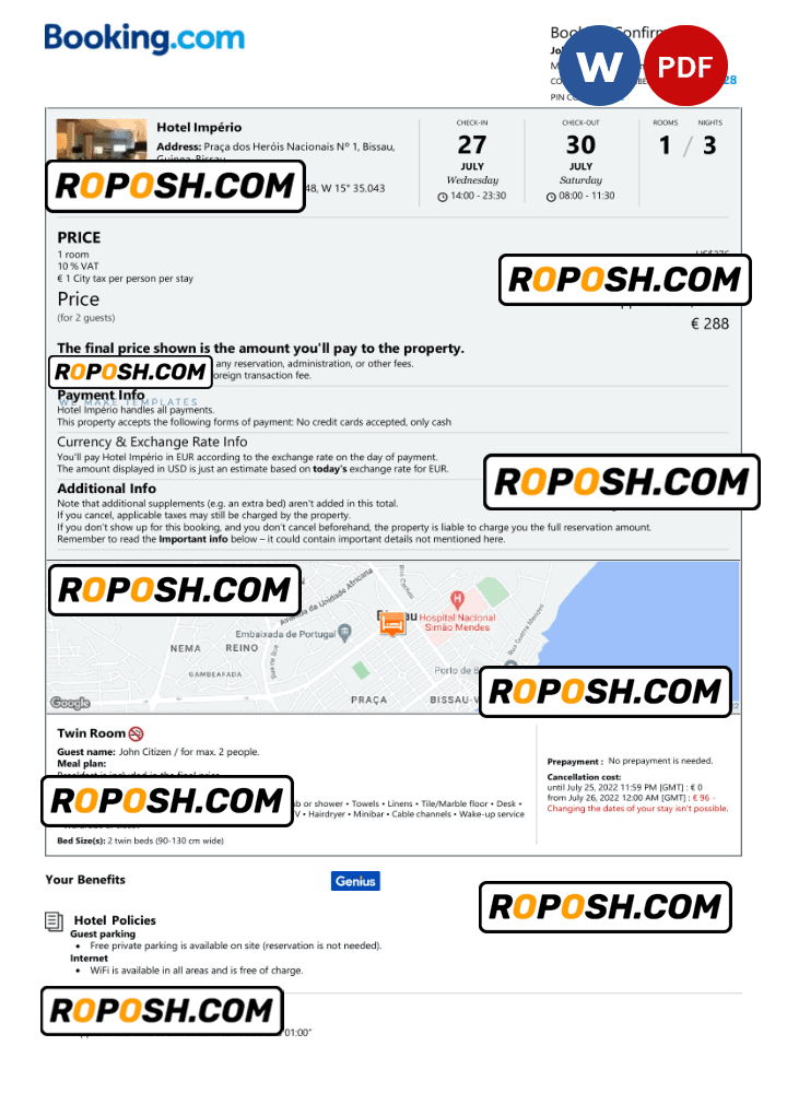 This Blank Guinea-Bissau hotel booking confirmation PDF Template is perfect for a variety of uses, such as Visa applications, proof of accommodation, showing your expenses, and more. You can even use it to create realistic copies of your credit card for novelty documents. We have a variety of other templates available, including passport templates, ID card templates, reciept template, and more.