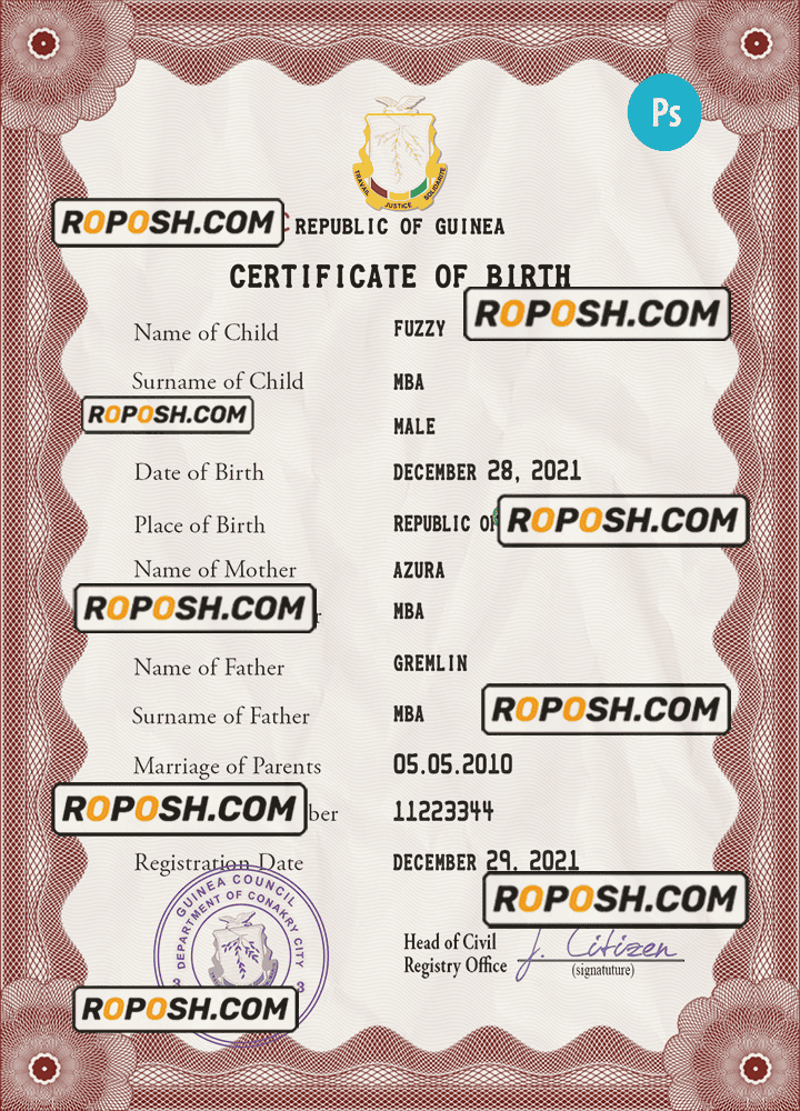roposh offers hundreds of high-quality, realistic, and customizable birth certificates. The Guinea birth certificate template is fully fillable, and you can complete it with any information you wish, such as name, surname, birth date, place of birth and etc. Whether you are using our PSD template (a layer-based adobe photoshop file) or our PDF template (a Microsoft Office editable file) you will get a package with fonts included instantly. No need to worry even if you can’t generate realistic birth proof yourself, we offer reliable editing service with your desired information for an extra charge. Also, we are always online and here to help you experience a confident purchase. So, reach out!