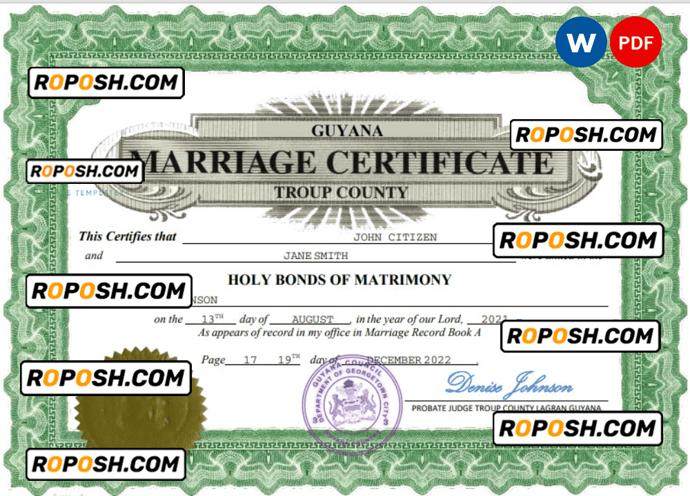 Get your printable Guyana marriage certificate templates now and join our growing list of satisfied customers!