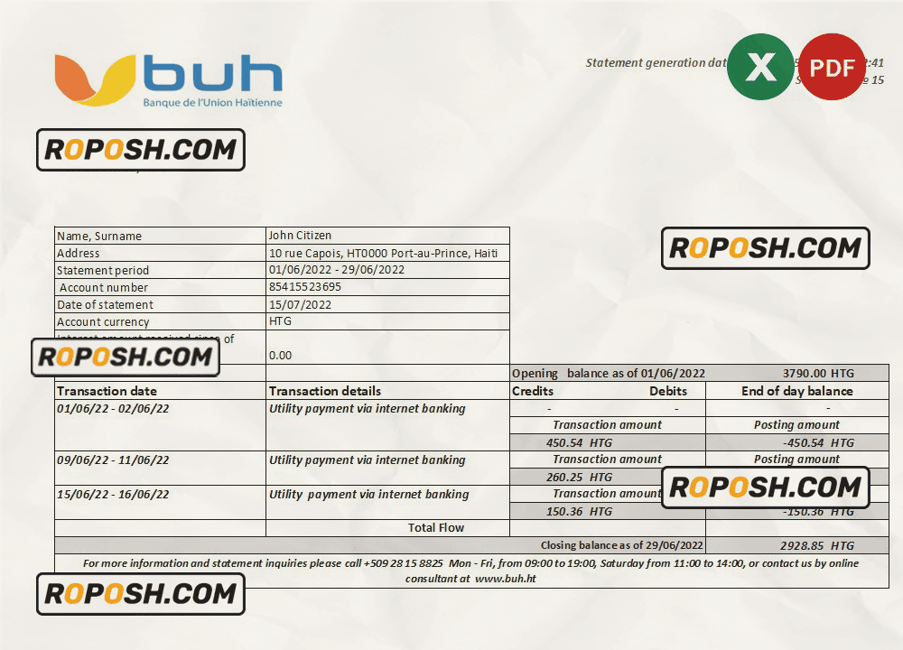 Haiti BUH Bank Statement Template in Excel and PDF Format