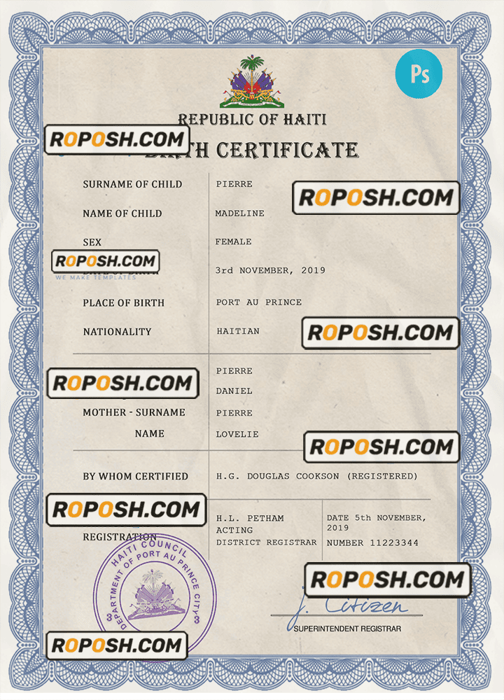 roposh offers hundreds of high-quality, realistic, and customizable birth certificates. The Haiti birth certificate template is fully fillable, and you can complete it with any information you wish, such as name, surname, birth date, place of birth and etc. Whether you are using our PSD template (a layer-based adobe photoshop file) or our PDF template (a Microsoft Office editable file) you will get a package with fonts included instantly. No need to worry even if you can’t generate realistic birth proof yourself, we offer reliable editing service with your desired information for an extra charge. Also, we are always online and here to help you experience a confident purchase. So, reach out!