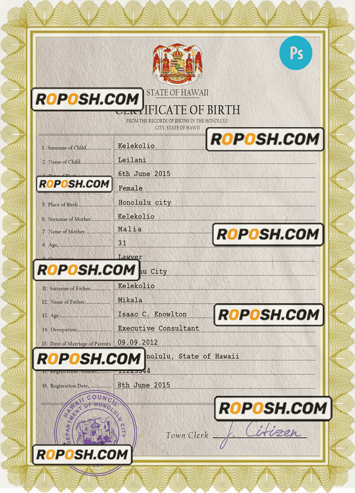 roposh offers hundreds of high-quality, realistic, and customizable birth certificates. The Hawaii birth certificate template is fully fillable, and you can complete it with any information you wish, such as name, surname, birth date, place of birth and etc. Whether you are using our PSD template (a layer-based adobe photoshop file) or our PDF template (a Microsoft Office editable file) you will get a package with fonts included instantly. No need to worry even if you can’t generate realistic birth proof yourself, we offer reliable editing service with your desired information for an extra charge. Also, we are always online and here to help you experience a confident purchase. So, reach out!