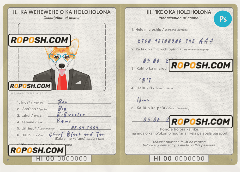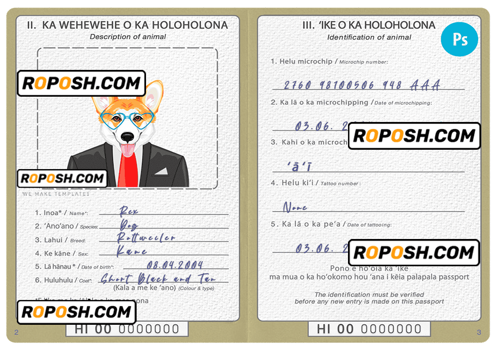 Hawaii dog (animal, pet) passport PSD template, is designed to look and feel like real documents. Each template is carefully crafted to include all the necessary details, such as your pet’s name, breed, date of birth, and microchip information. With our fillable cat or dog passport templates, you can quickly and easily create a editable pet passport that meets all the requirements for international travel.