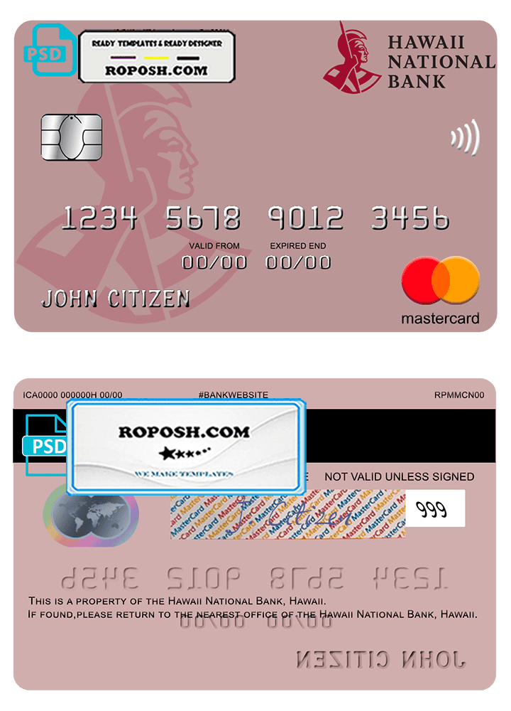 Elevate your identity with this high-quality, fully editable Hawaii National Bank mastercard PSD Template. With its easy customization and layer-based mastercard template, you can quickly and easily personalize this template to fit your needs. Simply use Adobe Photoshop or another photo editing software to add your own information, such as name, card number, expiration date, and CVV2.
