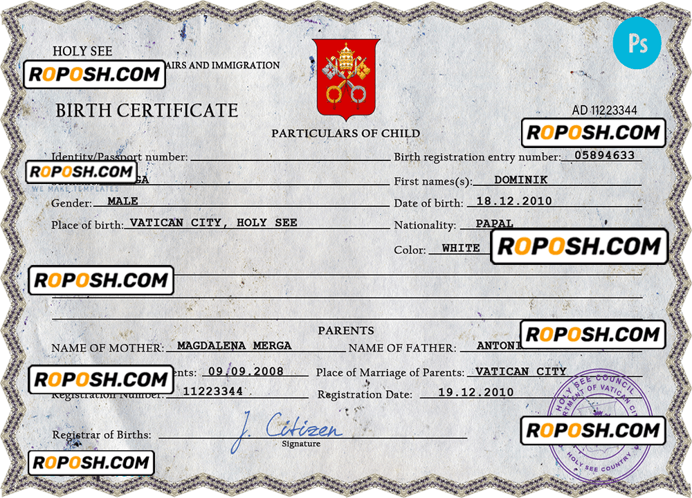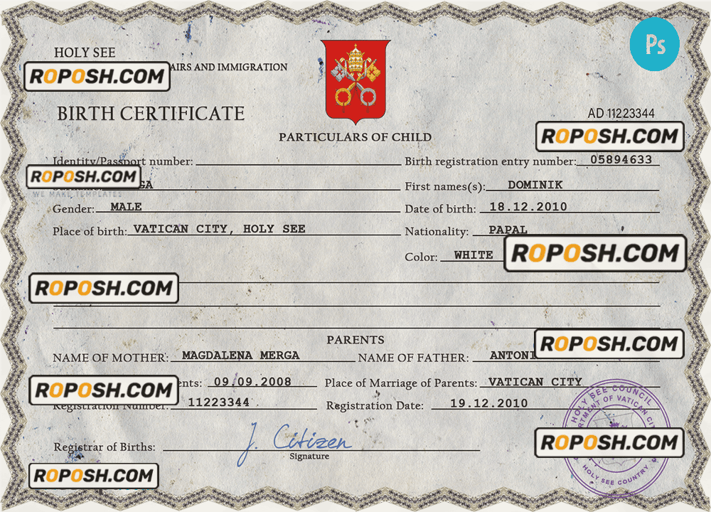 roposh offers hundreds of high-quality, realistic, and customizable birth certificates. The Holy See birth certificate template is fully fillable, and you can complete it with any information you wish, such as name, surname, birth date, place of birth and etc. Whether you are using our PSD template (a layer-based adobe photoshop file) or our PDF template (a Microsoft Office editable file) you will get a package with fonts included instantly. No need to worry even if you can’t generate realistic birth proof yourself, we offer reliable editing service with your desired information for an extra charge. Also, we are always online and here to help you experience a confident purchase. So, reach out!
