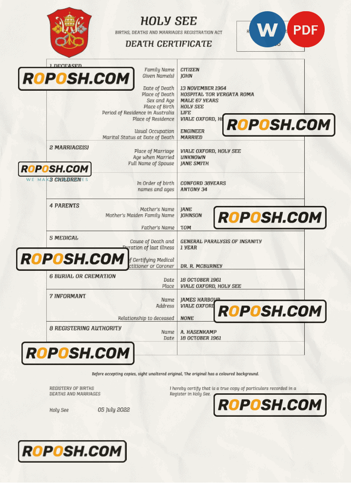 Explore a vast collection of legitimate-looking editable death certificates for several countries worldwide. The editable Holy See death certificates offers easy access to obtaining the required document for a variety of purposes, predominantly claiming life insurance, pensions, and resolving estates.