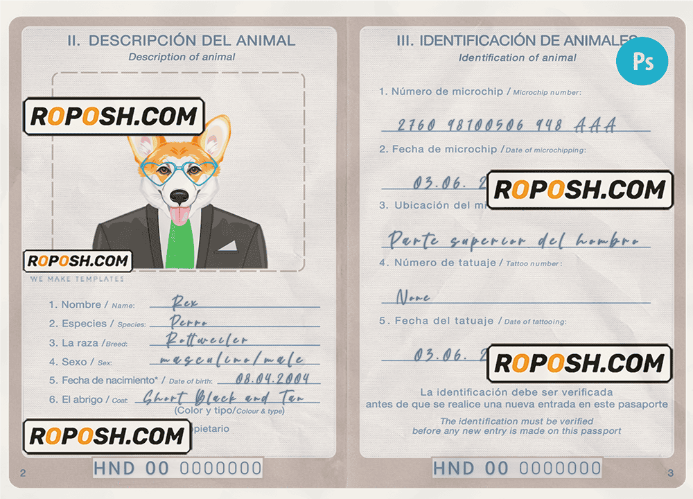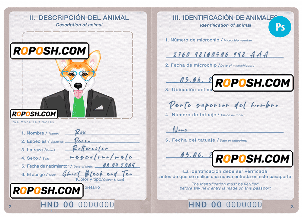 Honduras dog (animal, pet) passport PSD template, is designed to look and feel like real documents. Each template is carefully crafted to include all the necessary details, such as your pet’s name, breed, date of birth, and microchip information. With our fillable cat or dog passport templates, you can quickly and easily create a editable pet passport that meets all the requirements for international travel.