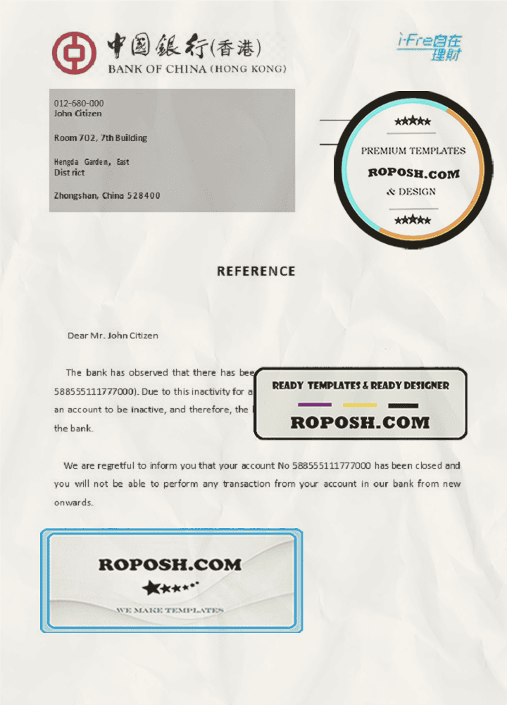 Hong Kong Bank of China bank account closure reference letter template in Word and PDF format