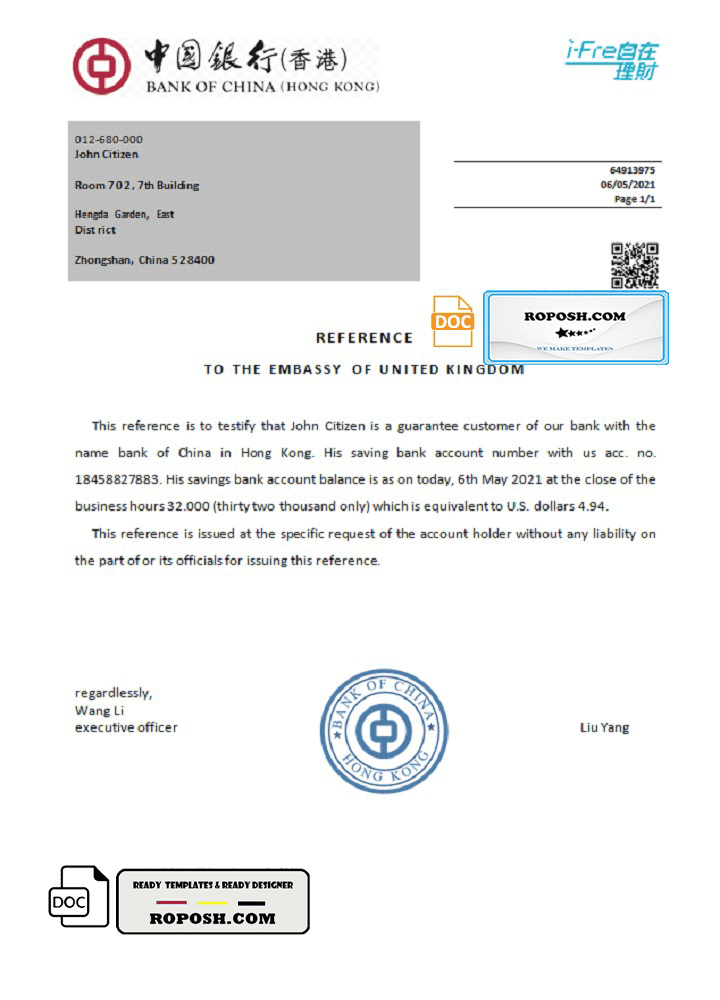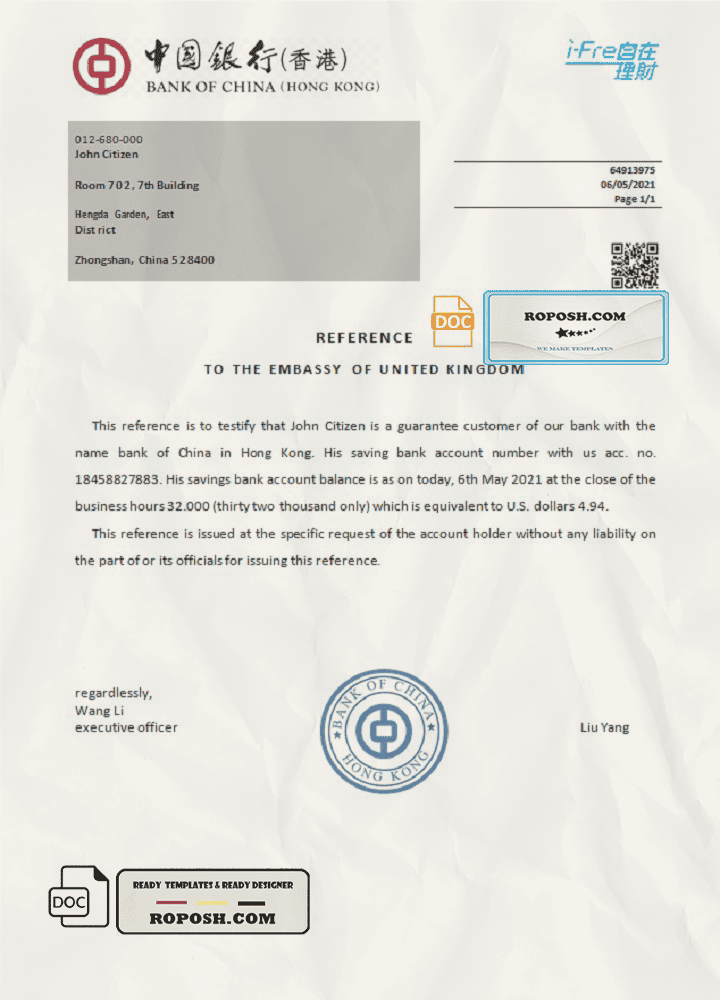 Hong Kong Bank of China bank account reference letter template in Word and PDF format