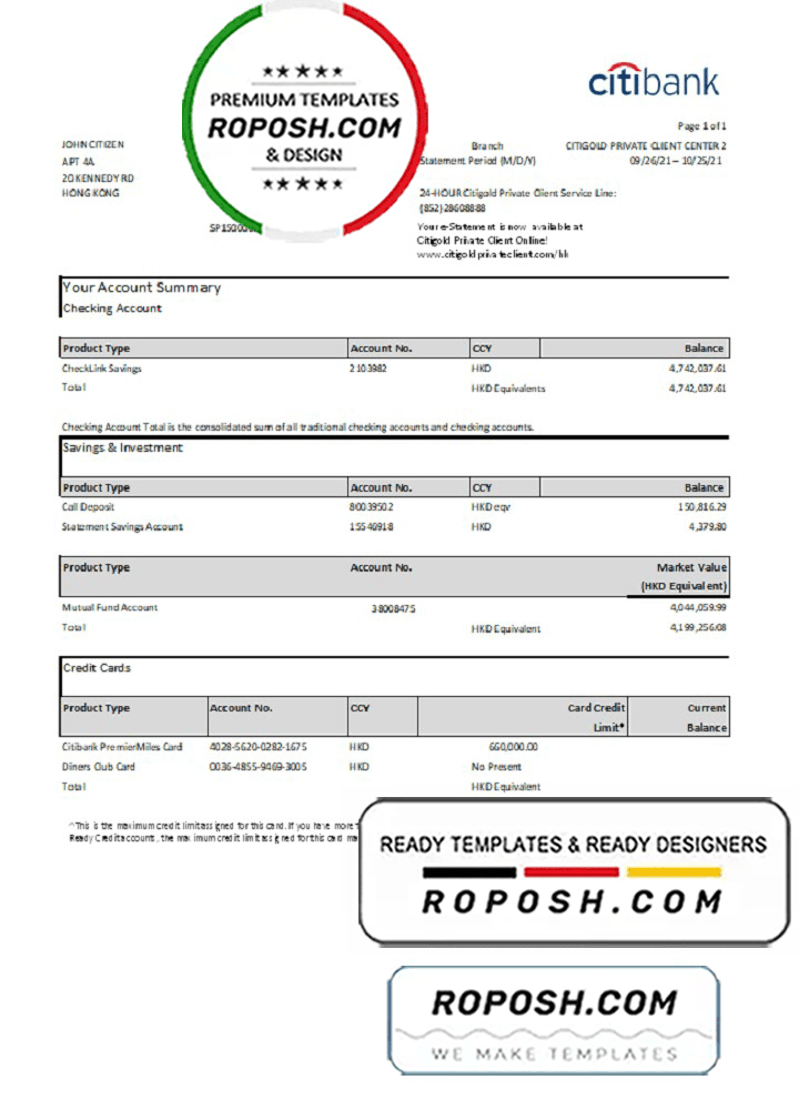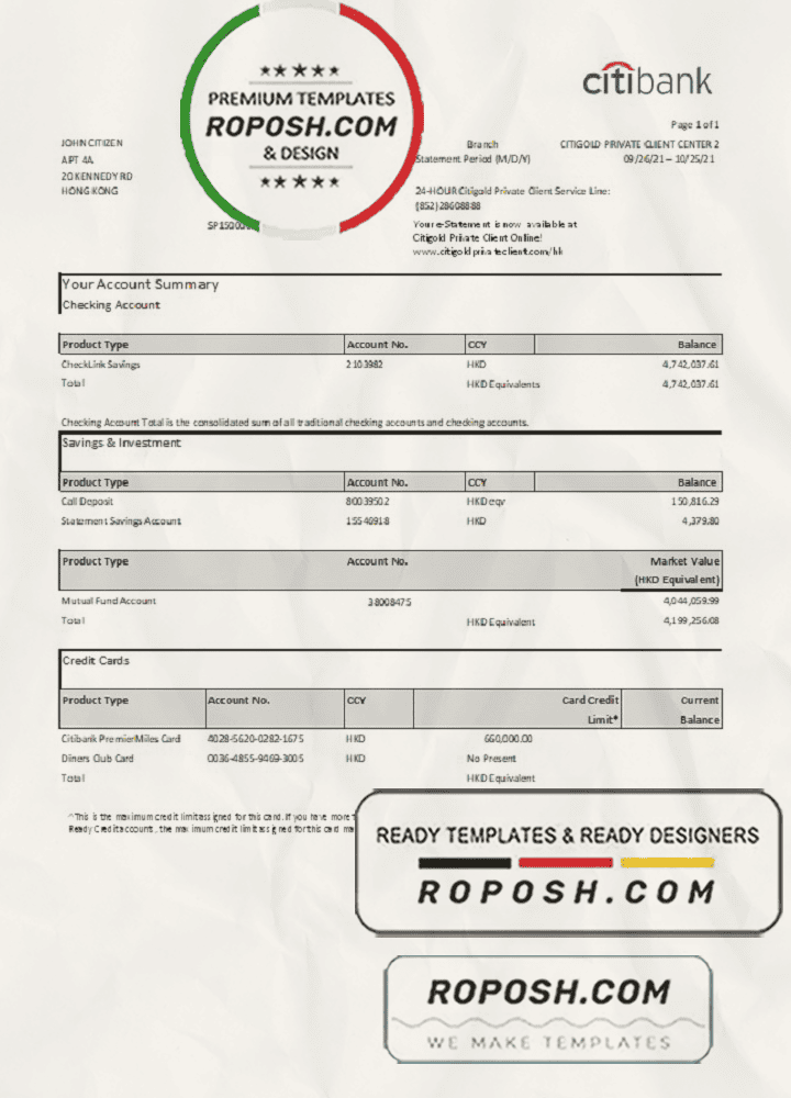 Download our fully editable Hong Kong Citibank credit card statement Excel template from Roposh and customize it with your information to create a realistic bank statement. This template is especially useful if your bank statement is expired, stolen, or unavailable. We also offer a variety of other templates, including editable credit card, ID card, bank statement PSD templates, driver’s license PSD templates, and printable editable blank utility bill templates.