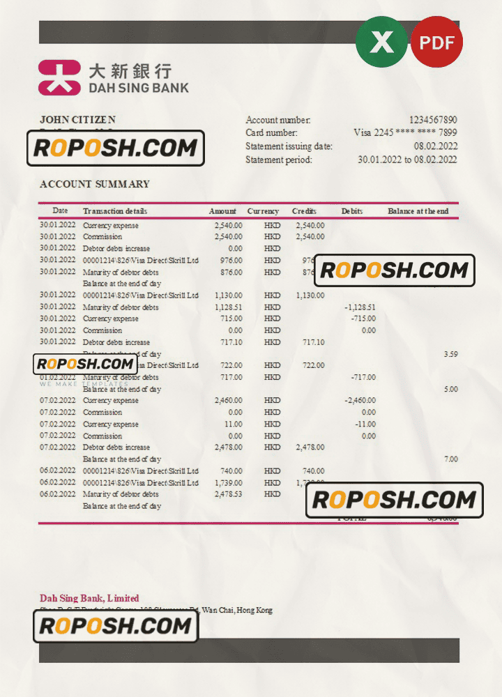 Grab now fully editable Hong Kong DAH Sing bank statement Excel Template from our website Roposh and put your own info to create Realistic Bank Statement template Excel and ready your own novelty documents. It’ll be so beneficial if your Bank Statement is expired, stolen or not available.We also have editable credit card, ID Card psd template, Bank Statement psd template, drivers license psd template & printable editable blank utility bill template.