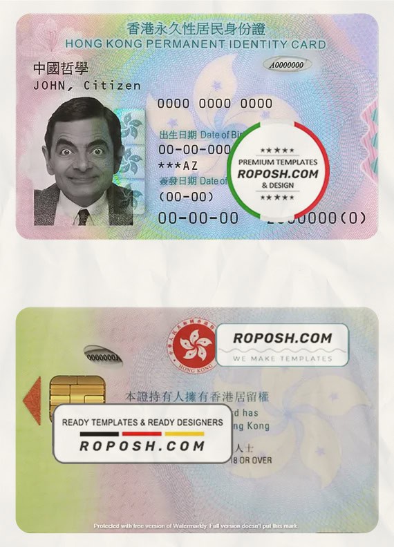 Discover our high-quality, fully editable Editable Hong Kong ID Card PSD Template. This premium Photoshop template is designed for easy customization, allowing you to modify details such as name, address, ID number, birth date, height, weight, expiration date, and photos. This layer-based PSD file is easy to edit with basic knowledge of Adobe Photoshop.