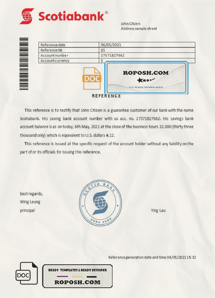Hong Kong Scotiabank reference letter template in Word and PDF format
