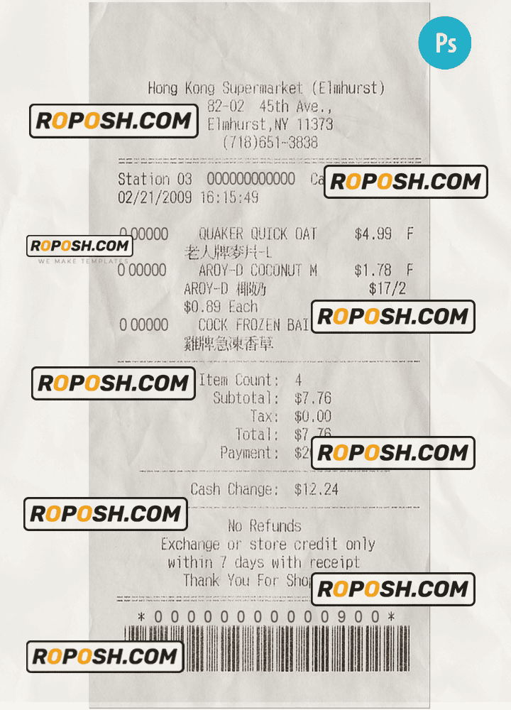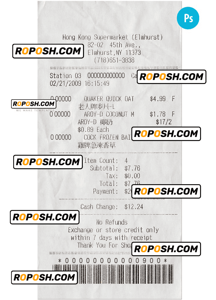 Features Editable HONG KONG SUPERMARKET Receipt PSD Template :