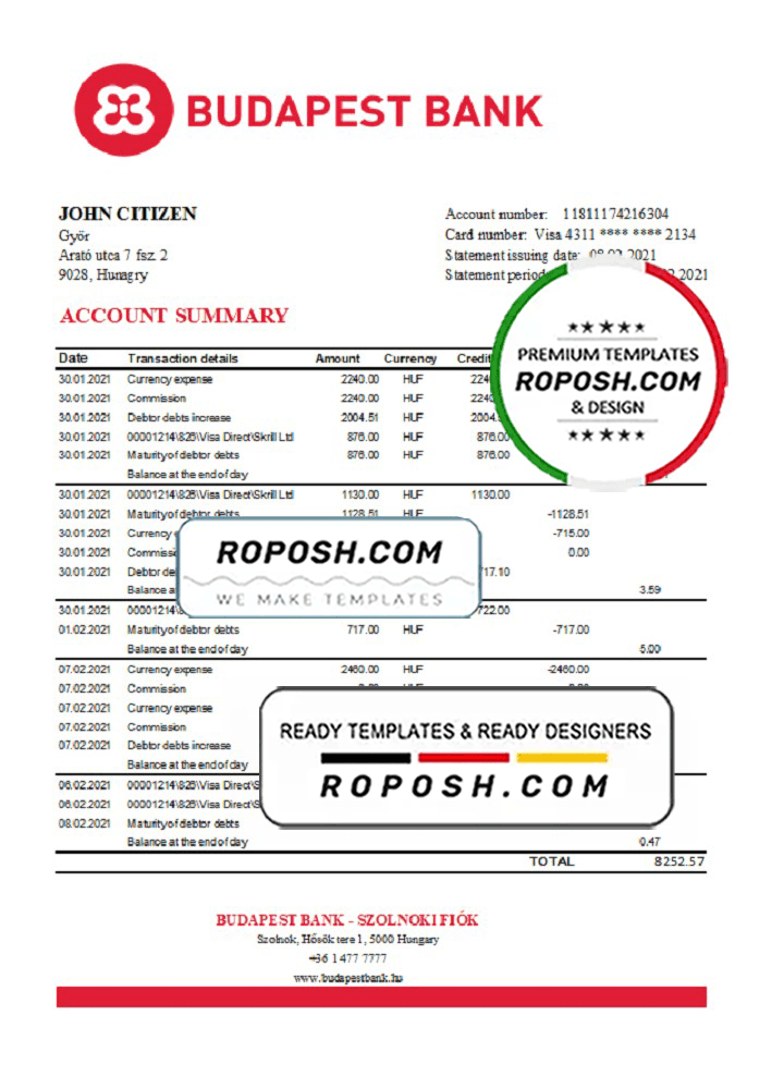 Grab now fully editable Hungary Budapest Bank – Szolnoki Fiók bank statement easy to fill Excel Template from our website Roposh and put your own info to create Realistic Bank Statement template Excel and ready your own novelty documents. It’ll be so beneficial if your Bank Statement is expired, stolen or not available.We also have editable credit card, ID Card psd template, Bank Statement psd template, drivers license psd template & printable editable blank utility bill template.
