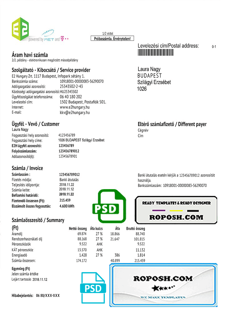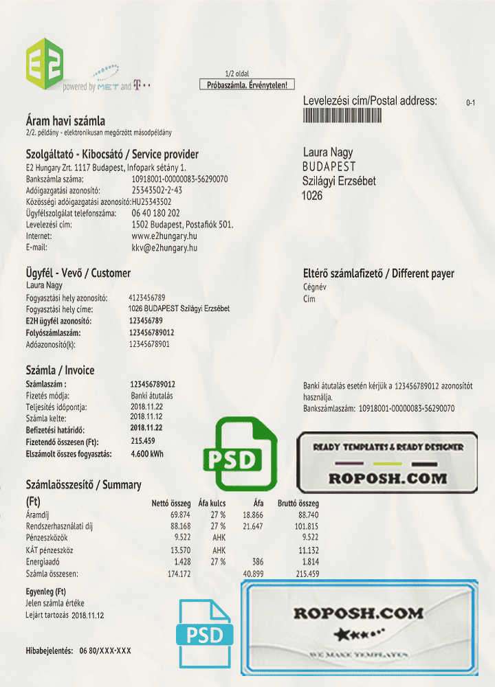 Get your blank Hungary E2 utility bill template from Roposh today. Customize it with your information to create a realistic editable utility bill for proof of address. Ideal for situations where your utility bill is expired, stolen, or unavailable. We also offer a variety of other templates, including passport PSD templates, ID card PSD templates, bank statement PSD templates, driver’s license PSD templates, and more.