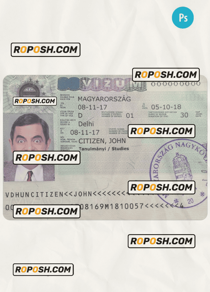 HUNGARY travel visa template psd. Buy Customizable Travel Visa Template with high quality and enjoy its unique features such as easy to customize, Layer based, fonts included sample. you can edit this template and  put any name, address, license number, Id number, birth date, height, weight, expire date, change photos etc. This Photoshop template is a layer based psd file and it’s easy to Editing.To modify this photoshop template file you will need a Photo editing software such as Adobe Photoshop No need to be expert on editing software like adobe Photoshop. However, You just have to basic knowledge on adobe photoshop, to edit this template. Never used low quality template. Your account may be suspended. Also, if you’re looking for an editable SSN template, Roposh is by your side so you can get it easily and even for free.