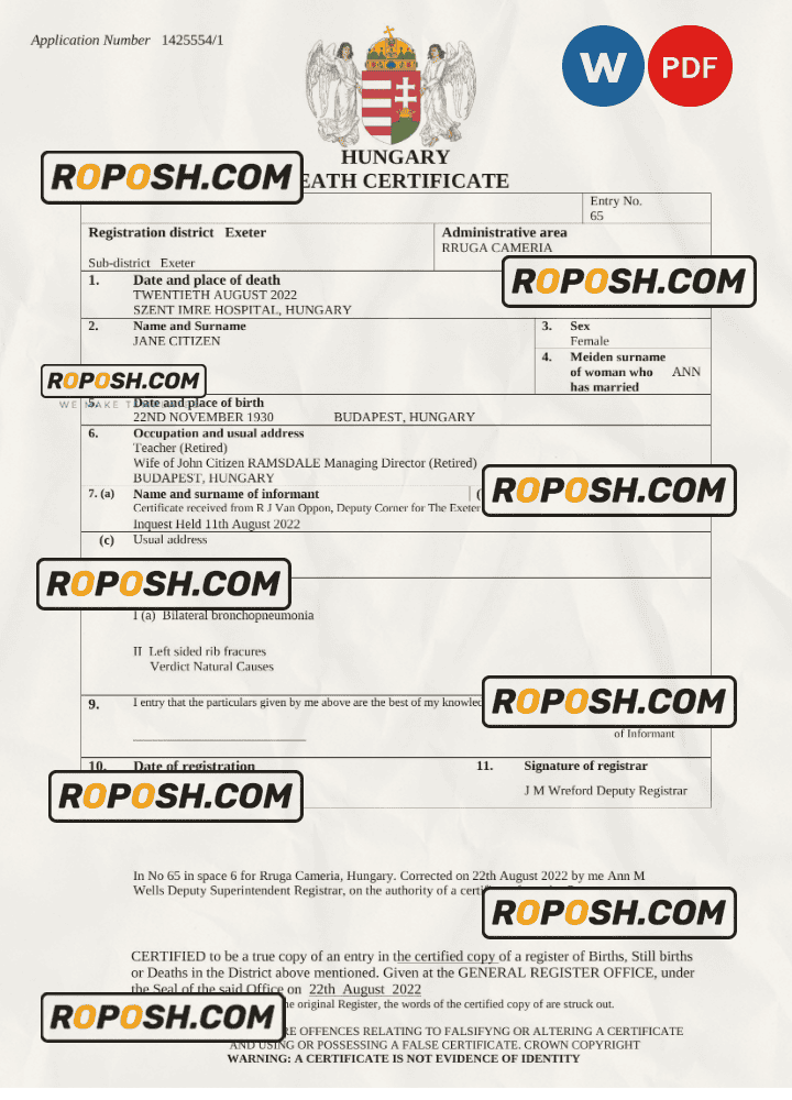 Explore a vast collection of legitimate-looking editable death certificates for several countries worldwide. The editable Hungary death certificates offers easy access to obtaining the required document for a variety of purposes, predominantly claiming life insurance, pensions, and resolving estates.