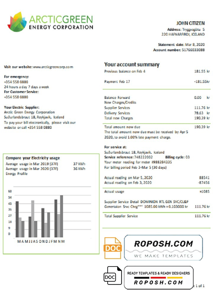 Get your Iceland Arctic Green Energy Corporation electricity utility bill template in Word and PDF formats. Perfect for those who have lost their original document, this high-quality fake template is ideal for identity verification on trade sites, digital currency platforms, and payment services. Download now for a seamless and professional solution.
