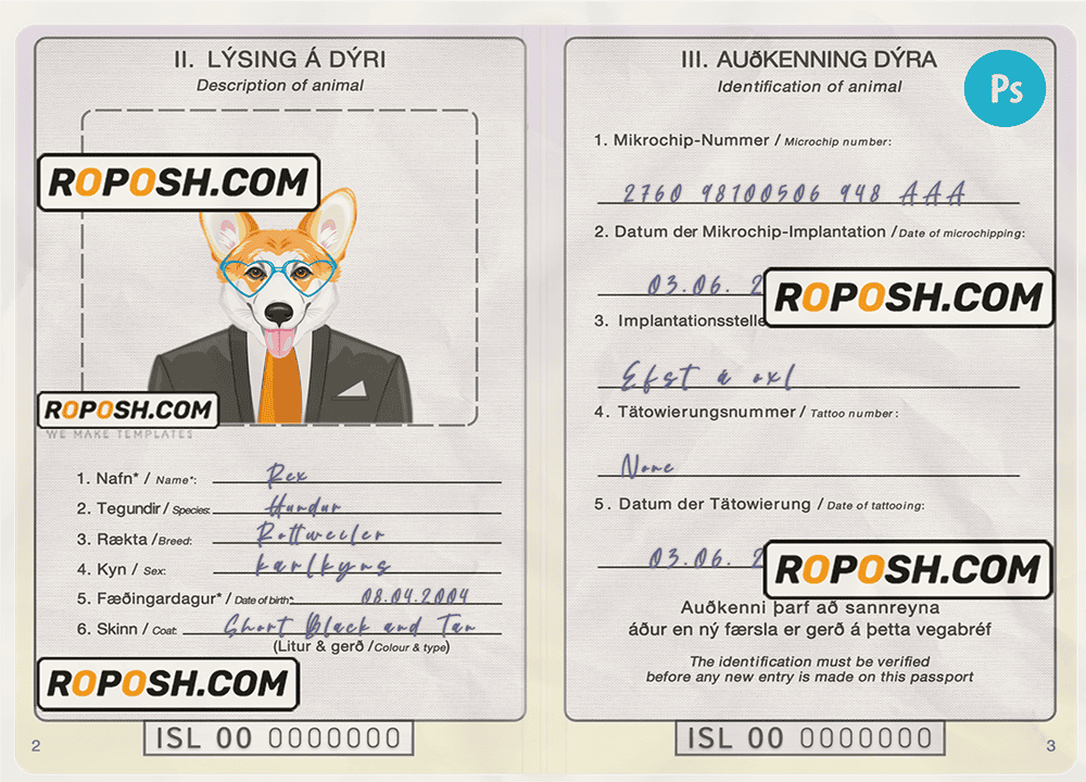 Iceland dog (animal, pet) passport PSD template, is designed to look and feel like real documents. Each template is carefully crafted to include all the necessary details, such as your pet’s name, breed, date of birth, and microchip information. With our fillable cat or dog passport templates, you can quickly and easily create a editable pet passport that meets all the requirements for international travel.